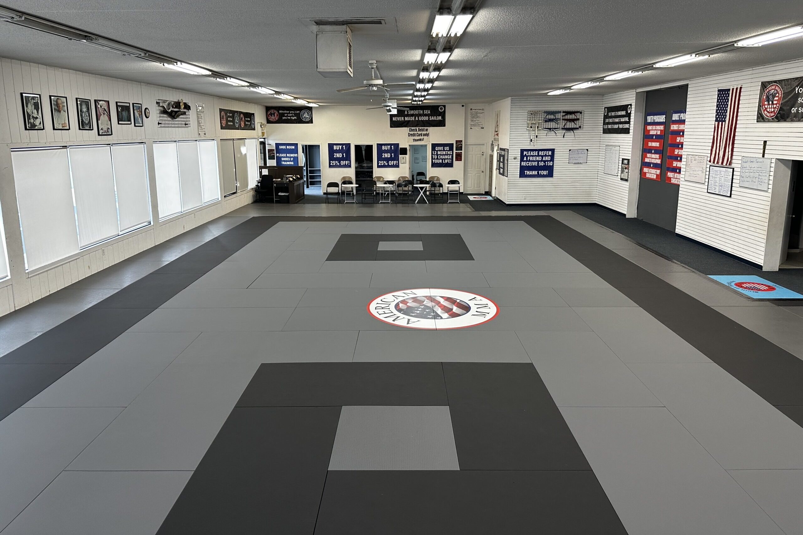 We have over 4200 square feet of the highest quality zebra mats. This is where the fundamentals training begins. Mixed Martial Arts (MMA), Brazilian Jiu Jitsu, and Muay Thai Kickboxing fundamentals are all taught in the front area. We can accommodate any size class no matter what discipline you choose.